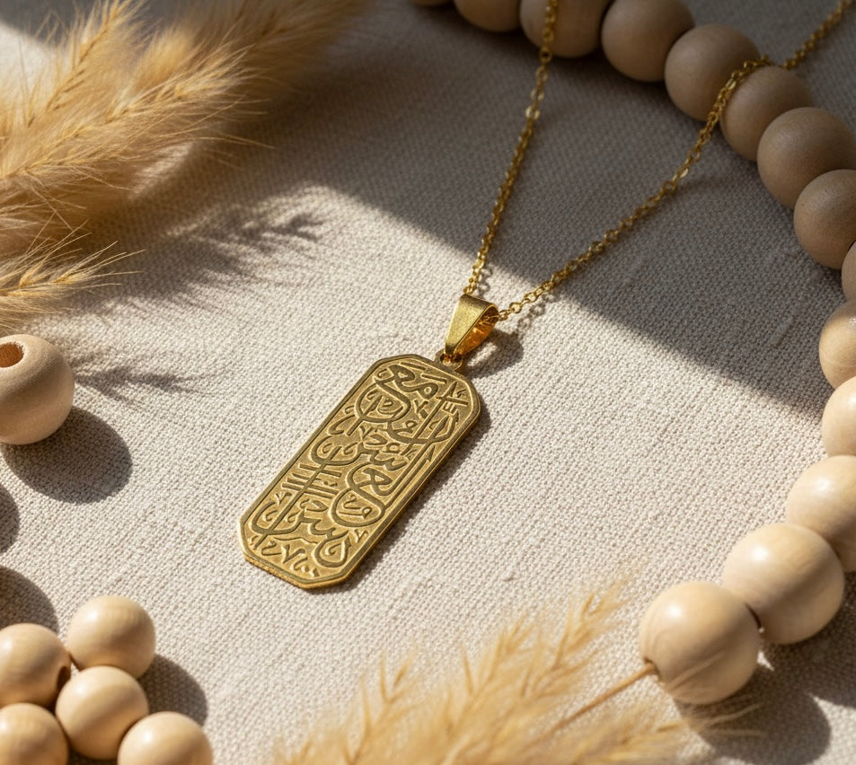 Elegantly crafted gold heart necklace featuring intricate Arabic writing, meaning"With Hardship Comes Ease."
